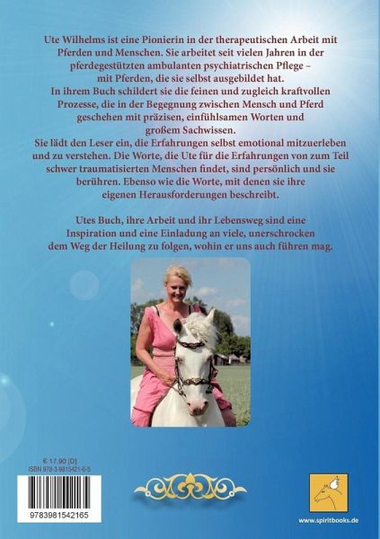 Ute Wilhelms ist eine Pionierin in der therapeutischen Arbeit mit Pferden und Menschen. Sie arbeitet seit vielen Jahren in der pferdegestützten ambulanten psychiatrischen Pflege mit Pferden, die sie selbst ausgebildet hat. In ihrem Buch schildert sie die feinen und zugleich kraftvollen Prozesse, die in der Begegnung zwischen Mensch und Pferd geschehen, mit präzisen, einfühlsamen Worten und großem Sachwissen. Sie lädt den Leser ein, die Erfahrungen selbst emotional mitzuerleben und zu verstehen.Die Worte, die Ute für die Erfahrungen von zum Teil schwer traumatisierten Menschen findet, sind persönlich, und sie berühren. Ebenso wie die Worte mit denen sie ihre eigenen Herausforderungen beschreibt. Utes Buch, ihre Arbeit und ihr Lebensweg sind eine Inspiration und eine Einladung an viele, unerschrocken dem Weg der Heilung zu folgen, wohin er uns auch führen mag.