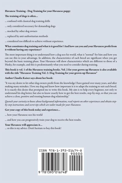 Havanese Training - Dog Training for your Havanese puppy The training of dogs is often... ... confused with classical dog training drills ... only considered necessary for demanding dogs ... mocked by other dog owners ... replaced by anti-authoritarian methods ... considered too difficult to achieve without experience. What constitutes dog training and what is it good for? And how can you and your Havanese profit from it without having any experience? The most important thing is to understand how a dog sees his world, what is "normal" for him and how you can use this to your advantage. In addition, the characteristics of each breed are significant when you get beyond the basic training phase. Your Havanese will show characteristics which are different to those of a Husky, for example, and this is predominantly what you need to consider during training. This book is vol. 1 of the Havanese training books. Vol. 2 for your grown up Havanese is also available with the title "Havanese Training Vol. 2: Dog Training for your grown-up Havanese" Author Claudia Kaiser says about her book: "It was my desire to let other dog owners profit from the knowledge I have gained over many years, and after making many mistakes. I love my dog and know how important it is to adapt the training to suit each breed. It is exactly this desire that prompted me to write this book. My aim is to help every beginner, not only to understand his dog better, but also to know exactly how to get the best results, step-by-step, so that you can achieve a close, positive and trusting human-dog relationship." Quench your curiosity to know about background information, read reports on other experiences and obtain step-by-step instructions and secret tips which are tailor-made for your Havanese. Get your copy of this book today and experience... ... how your Havanese sees his world ... and how you can progressively train your dog to receive the best results. Your Havanese will appreciate it... ... so this is my advice: Don't hesitate to buy this book! Content of this book: About the Author Preface What you need to know about your Havanese Cornerstones of training puppies Before the puppy arrives The first few weeks The first commands Training basic knowledge Special Chapter – The hunting instinct Check list for the start Conclusion