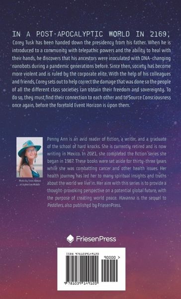 Penny Ann es una avida lectora de libros de ficción, escritora, graduada de la universidad de la vida, està actualmente retirada y escribe desde Mexico, En 2021 ella completo la serie de ficción que inicio en 1987, este libro estuvo esperando 33 años para ser terminado mientras su autora luchaba contra el cáncer y otros problemas de salud, Y en su lucha por su propia salud ha viajado hacia muchas ideas espirituales y verdades acerca del mundo en que vivimos. El objetivo de esta serie es proporcionar una perspectiva que invita a reflexionar sobre un posible futuro, con el firme propósito de crear un mundo mas pacifico, Havanna es la secuela de Peddlers, la cual también es publicada por FriesenPress.