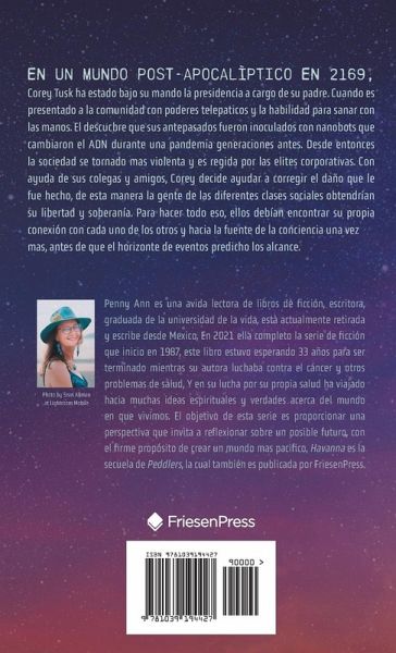 Penny Ann es una avida lectora de libros de ficción, escritora, graduada de la universidad de la vida, està actualmente retirada y escribe desde Mexico, En 2021 ella completo la serie de ficción que inicio en 1987, este libro estuvo esperando 33 años para ser terminado mientras su autora luchaba contra el cáncer y otros problemas de salud, Y en su lucha por su propia salud ha viajado hacia muchas ideas espirituales y verdades acerca del mundo en que vivimos. El objetivo de esta serie es proporcionar una perspectiva que invita a reflexionar sobre un posible futuro, con el firme propósito de crear un mundo mas pacifico, Havanna es la secuela de Peddlers, la cual también es publicada por FriesenPress.