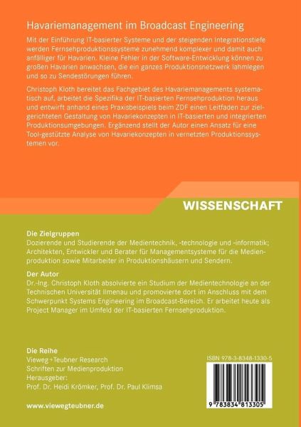 Christoph Kloth bereitet das Fachgebiet des Havariemanagements systematisch auf, arbeitet die Spezifika der IT-basierten Fernsehproduktion heraus und entwirft anhand eines Praxisbeispiels beim ZDF einen Leitfaden zur zielgerichteten Gestaltung von Havariekonzepten in IT-basierten und integrierten Produktionsumgebungen. Ergänzend stellt der Autor einen Ansatz für eine Tool-gestützte Analyse von Havariekonzepten in vernetzten Produktionssystemen vor.