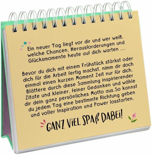 Du möchtest jeden Tag mit einem schönen und inspirierenden Motto beginnen? In diesem kleinen Aufstellbuch findest du 144 positive Tagesmottos, die genau das bewirken. Die große Vielfalt an unterschiedlichen guten Wünschen für dich oder deine Lieben sorgen dafür, dass du deinen Tag schon am Morgen motiviert und gut gelaunt beginnst. Auch als kleines Dankeschön eignet sich dieser Aufsteller perfekt, um einer lieben Freundin, deiner Mutter oder Kollegin ein Lächeln ins Gesicht zu zaubern.