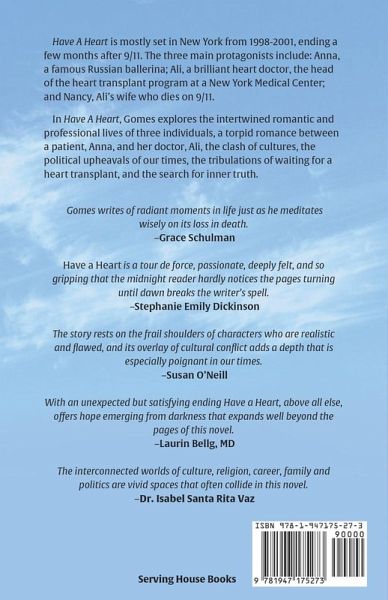 Have A Heart is mostly set in New York from 1998-2001, ending a few months after 9/11. The three main protagonists include: Anna, a famous Russian ballerina; Ali, a brilliant heart doctor, the head of the heart transplant program at a New York Medical Center; and Nancy, Ali's wife who dies on 9/11.