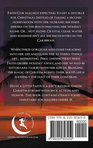 Faith Cox was not expecting to get a divorce for Christmas. Instead of taking a second honeymoon with her husband, she finds herself on the beach enjoying her holiday alone. Or... not alone. Crystal clear water and sunshine isn't all she encounters in the Caribbean. When three gorgeous men come parading into her life and claim her as theirs, things get... interesting. Peril unexpectedly finds Faith on her holiday away, and her would-be suitors are tasked with her rescue. Bringing the magic of Christmas into their mate's life is suddenly the least of their concerns. Have a Little Faith is a juicy reverse harem Christmas romp with spice, action, and humor. This book contains steamy scenes unsuitable for readers under 18.