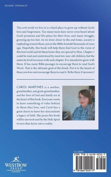 This evil world we live in is a hard place to grow up without God's love and forgiveness. Too many teens have never even heard about God's promises and His plans for their lives, and many struggle, growing up too fast. As we draw closer to the end times, society is imploding around them, just as the Bible foretold thousands of years ago. Hopefully, this book will help them find God in the ruins of this lost world and let them know they are special to Him. Chapter 1 could be read and understood by most ten-year-old children, but the maturity level increases with each chapter. It is intended to grow with them. It has many Bible passages to encourage them to read God's Word. That is the ultimate goal of this book. Put it in the hands of those you love and encourage them to read it. Bribe them if necessary!
