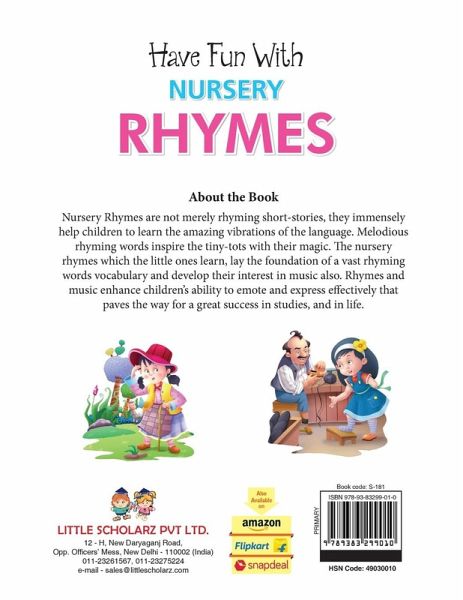 Nursery Rhymes are not merely rhyming short-stories, they immensely help children to learn the amazing vibrations of the language. Melodious rhyming words inspire the tiny-tots with their magic. The nursery rhymes which the little ones learn, lay the foundation of a vast rhyming words vocabulary and develop their interest in music also. Rhymes and music enhance children's ability to emote and express effectively that paves the way for a great success in studies, and in life.
