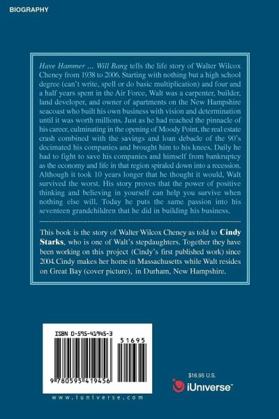 Have Hammer.Will Bang tells the life story of Walter Wilcox Cheney from 1938 to 2006. Starting with nothing but a high school degree and four and a half years spent in the Air Force, Walt developed land and built homes on the New Hampshire seacoast with vision and determination until his business was worth millions. Just as he had reached the pinnacle of his career, culminating in the opening of Moody Point, the real estate crash combined with the savings and loan debacle of the 90's decimated his companies and brought him to his knees. Daily he had to fight to save his companies and himself from bankruptcy as the economy and life in that region spiraled down into a recession. Although it took years longer than he thought it would, Walt survived the worst. His story proves that the power of positive thinking and believing in yourself can help you survive when nothing else will. Having found a new passion for life in his grandchildren, he is now working on leaving everything to them and hopes to pass on to them his love of life and the passion he once had for his work.