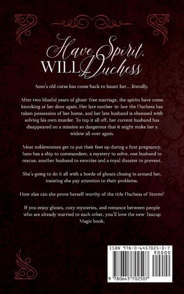 Juno's old curse has come back to haunt her... literally. After two blissful years of ghost-free marriage, the spirits have come knocking at her door again. Her late mother-in-law has taken possession of her home, and her late husband is obsessed with solving his own murder. To top it all off, her current husband has disappeared on a mission so dangerous that it might make her a widow all over again. Most noblewomen get to put their feet up during a first pregnancy. Juno has a ship to commandeer, a mystery to solve, one husband to rescue, another husband to exorcise and a royal disaster to prevent. She's going to do it all with a horde of ghosts closing in around her, insisting she pay attention to their problems. How else can she prove herself worthy of the title Duchess of Storm? If you enjoy ghosts, cozy mysteries, and romance between people who are already married to each other, you'll love the new Teacup Magic book.