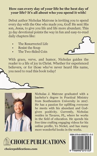 How can every day of your life be the best day of our life? It's all about who you spend it with! Debut author Nicholas Matrone is inviting you to spend every day with the One who made you, God! He sent His son, Jesus, to give you life and life more abundant. This 31-day devotional points the way in fun and easy-to-read daily chapters like:The Resurrected Life Resist the Soup The Two-Sided Coin With grace, verve, and humor, Nicholas guides the reader to a life of joy in Christ - whether for experienced believers or for those who've never heard His name - you need to read this book today!