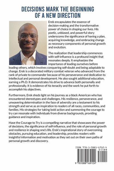Give yourself the permission to change the trajectory of your Life! Individuals are enthralled by the possibility of realizing their full potential. To reach the next level, you must understand the importance of action that will guarantee your desired outcome. Dr. Clacks provides not just useful and practical advice but also invaluable insight that can be applied to all aspects of life to achieve success with 9 strategies. His world was filled with poverty, racism, prejudice, and violence. By changing his behaviors, priorities and taking concrete steps to reach his dreams, he transformed from a young man with no future goals to a military commander and educator. He defied the odds and achieved success. He now provides concrete steps to reach your dreams. You will learn what to do and the actions required to achieve the results you desire in life. Erek recounts his life story and reveals the 90-10 Rule, showing a practical strategy that anybody can use to achieve extraordinary results. Your life will never be the same after you employ the practical techniques in this book. Everything in your environment changes when you change. Have the Courage to Try: Overcome Adversity and Achieve Your Goals is meant for everyone desiring to realize their full potential and achieve success.