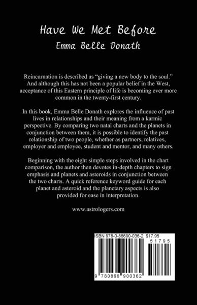 Reincarnation is described as "giving a new body to the soul." And although this has not been a popular belief in the West, acceptance of this Eastern principle of life is becoming ever more common in the twenty-first century. In this book, Emma Belle Donath explores the influence of past lives in relationships and their meaning from a karmic perspective. By comparing two natal charts and the planets in conjunction between them, it is possible to identify the past relationship of two people, whether as partners, relatives, employer and employee, student and mentor, and many others. Beginning with the eight simple steps involved in the chart comparison, the author then devotes in-depth chapters to sign emphasis and planets and asteroids in conjunction between the two charts. A quick reference keyword guide for each planet and asteroid and the planetary aspects is also provided for ease in interpretation.