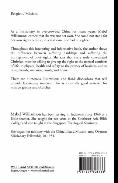 As a missionary in overcrowded China for many years, Mabel Williamson learned that she was not her own. She could not stand for her own rights because, in a real sense, she had no rights. Throughout this interesting and informative book, the author shows you the difference between suffering hardships and suffering the infringement of one's rights. She says that every truly consecrated Christian must be willing to give up the right to the normal comforts of life, to physical health and safety, to the privacy of business, and to time, friends, romance, family, and home. There are numerous illustrations and frank discussions that will provide you with fascinating material. This is especially good material for mission groups and churches.