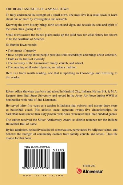 THE HEART AND SOUL OF A SMALL TOWN To fully understand the strength of a small town, one must live in a small town or learn about one or more by investigation and research. Knowing the town history brings forth action and vigor, and reveals the soul and spirit of the town, thus, giving it life. Small towns across the fruited plains make up the solid base for what history has shown to be the heartland of America. Ed Buntin Town reveals: The impact of tragedy. How people caring about people provides solid friendships and brings about cohesion. Faith as the basis of morality. The necessity of the triumvirate: family, church, and school. The meaning of Hoosier Hysteria, an Indiana tradition. Here is a book worth reading, one that is uplifting in knowledge and fulfilling to the reader.