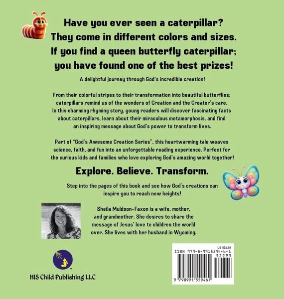 Have you ever seen a caterpillar? They come in different colors and sizes. If you find a queen butterfly caterpillar; you have found one of the best prizes! Have You Ever Seen a Caterpillar? A delightful journey through God's incredible creation! From their colorful stripes to their transformation into beautiful butterflies, caterpillars remind us of the wonders of Creation and the Creator's care. In this charming rhyming story, young readers will discover fascinating facts about caterpillars, learn about their miraculous metamorphosis, and find an inspiring message about God's power to transform lives. Part of the God's Awesome Creation Series, this heartwarming tale weaves science, faith, and fun into an unforgettable reading experience. Perfect for curious kids and families who love exploring God's amazing world together! Explore. Believe. Transform. Step into the pages of this book and see how God's creations can inspire you to reach new heights!