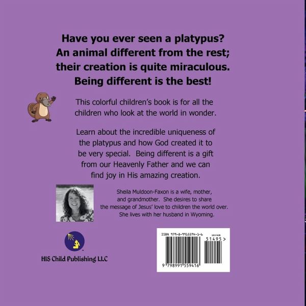 This colorful children's book is for all the children who look at the world in wonder. They will learn about the incredible uniqueness of the platypus and how God created it to be very special. Being different is a gift from our Heavenly Father and we can find joy in His amazing creations.