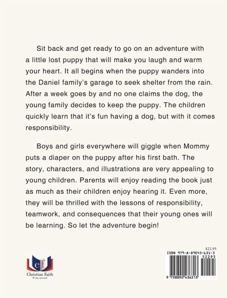 Sit back and get ready to go on an adventure with a little lost puppy that will make you laugh and warm your heart. It all begins when the puppy wanders into the Daniel family's garage to seek shelter from the rain. After a week goes by and no one claims the dog, the young family decides to keep the puppy. The children quickly learn that it's fun having a dog, but with it comes responsibility. Boys and girls everywhere will giggle when Mommy puts a diaper on the puppy after his first bath. The story, characters, and illustrations are very appealing to young children. Parents will enjoy reading the book just as much as their children enjoy hearing it. Even more, they will be thrilled with the lessons of responsibility, teamwork, and consequences that their young ones will be learning. So let the adventure begin! New blurb to be placed as is below: