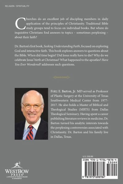 Churches do an excellent job of discipling members in daily application of the principles of Christianity. Traditional Bible study groups tend to focus on individual books. But where do inquisitive Christians find answers to topics - sometimes perplexing - about their faith? Dr. Barton's first book, Seeking Understanding Faith, focused on exploring God and interactive faith. This book explores answers to questions about the Bible. When did time begin? Did Jesus really have to die? Why do we celebrate Jesus' birth at Christmas? What happened to the apostles? Have You Ever Wondered? addresses such questions.