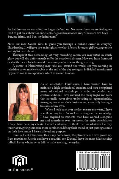 As hairdressers we can afford to forget the 'real us'. No matter how we are feeling we tend to put on a 'show' for our clients. A good friend once said, "There are two Sue's - Sue, my friend, and Sue, my hairdresser!" Have You Had Lunch? aims to guide you through a realistic career in everyday Hairdressing. It will give you an insight as to what life as a Saturday girl/boy, apprentice and stylist is all about. Throughout this demanding yet very rewarding career, you may bathe in much glory, but will also unfortunately suffer the occasional disaster. How you learn from and deal with these obstacles could transform you in to something amazing. A career in Hairdressing may take you around the world, see you working in television or on movie sets, but at the end of the day seeing an individual transformed by your vision is an experience which is second to none.