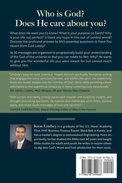 Who is God? Does He care about you? What does He want you to know? What is your purpose on Earth? Why is your life not perfect? Is there any hope in this out-of-control world? Can you actually know God? Have You Heard from God Lately? 30 Messages from Heaven to You helps you discover the answers to these all-important questions. The messages are organized to progressively build your understanding of the God of the universe so that you can relate to Him. Why? He wants to give you the wonderful life you were made for but cannot reach without Him. In this book you'll encounter the divine dialogue between God and humanity, revelations about His nature, and insights into people and our problems. All the messages prepare us for the ultimate Messenger and the ultimate Message. Who and what are they? Read it to find out!