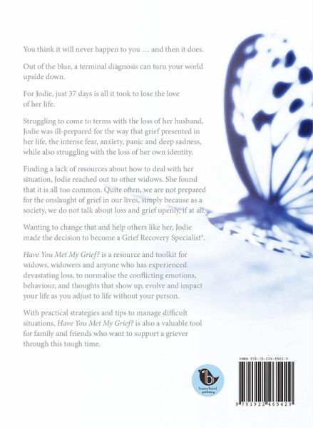 You think it will never happen to you ... and then it does. Out of the blue, a terminal diagnosis can turn your world upside down. For Jodie, just 37 days is all it took to lose the love of her life. Struggling to come to terms with the loss of her husband, Jodie was ill-prepared for the way that grief presented in her life, the intense fear, anxiety, panic and deep sadness, while also struggling with the loss of her own identity. Finding a lack of resources about how to deal with her situation, Jodie reached out to other widows. She found that it is all too common. Quite often, we are not prepared for the onslaught of grief in our lives, simply because as a society, we do not talk about loss and grief openly, if at all. Wanting to change that and help others like her, Jodie made the decision to become a Grief Recovery Specialist®. Have You Met My Grief? is a resource and toolkit for widows, widowers and anyone who has experienced devastating loss, to normalise the conflicting emotions, behaviour, and thoughts that show up, evolve and impact your life as you adjust to life without your person. With practical strategies and tips to manage difficult situations, Have You Met My Grief? is also a valuable tool for family and friends who want to support a griever through this tough time.