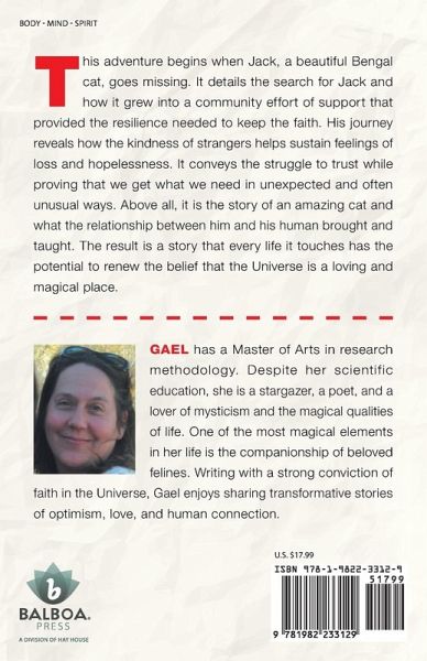 This adventure begins when Jack, a beautiful Bengal cat, goes missing. It details the search for Jack and how it grew into a community effort of support that provided the resilience needed to keep the faith. His journey reveals how the kindness of strangers helps sustain feelings of loss and hopelessness. It conveys the struggle to trust while proving that we get what we need in unexpected and often unusual ways. Above all, it is the story of an amazing cat and what the relationship between him and his human brought and taught. The result is a story that every life it touches has the potential to renew the belief that the Universe is a loving and magical place.