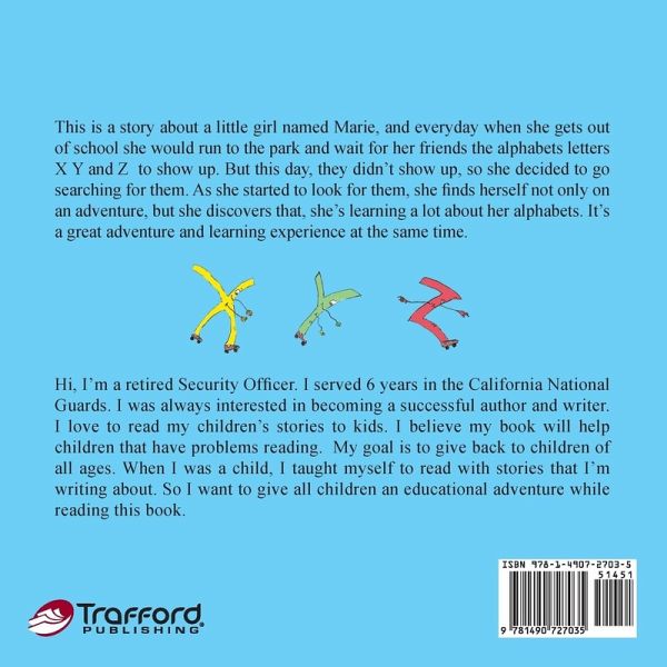 This is a story about a little girl named Marie, and every day when she gets out of school, she would run down to the park and wait for her friends, the letters X, Y, and Z, to show up, but this day, they didn't show up, so she decides to go searching for them. As she starts to look for them, she finds herself not only on an adventure, but she discovers that she is learning a lot about her alphabet. It is a great adventure and learning experience at the same time.
