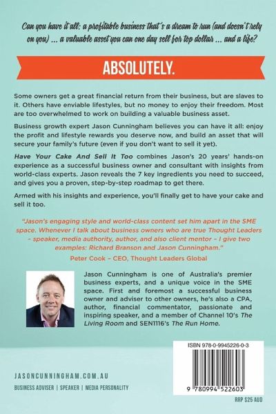 Can you have it all: a profitable business that’s a dream to run (and doesn’t rely on you)… a valuable asset you can one day sell for top dollar…and a life? ABSOLUTELY. Some owners get a great financial return from their business, but are slaves to it. Others have enviable lifestyles, but no money to enjoy their freedom.Most are too overwhelmed to work on building a valuable business asset. Business growth expert Jason Cunningham believes you can have it all: enjoythe profit and lifestyle rewards you deserve now, and build an asset that will secure your family’s future (even if you don’t want to sell it yet). Have Your Cake And Sell It Too combines Jason’s 20 years’ hands-on experience as a successful business owner and consultant with insights from world-class experts. Jason reveals the 7 key ingredients you need to succeed, and gives you a proven, step-by-step roadmap to get there. Armed with his insights and experience, you’ll finally get to have your cake and sell it too. "Jason’s engaging style and world-class content set him apart in the SME space. Whenever I talk about business owners who are true Thought Leaders – speaker, media authority, author, and also client mentor– I give two examples: Richard Branson and Jason Cunningham." Peter Cook – CEO, Thought Leaders Global