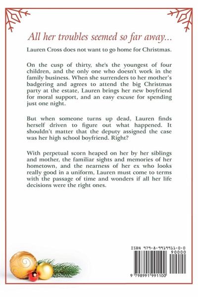 Lauren Cross does not want to go home for Christmas. On the cusp of thirty, she's the youngest of four children, and the only one who doesn't work in the family business. When she surrenders to her mother's badgering and agrees to attend the big Christmas party at the estate, Lauren brings her new boyfriend for moral support, and an easy excuse for spending just one night. But when someone turns up dead, Lauren finds herself driven to figure out what happened. It shouldn't matter that the deputy assigned the case was her high school boyfriend. Right? With perpetual scorn heaped on her by her siblings and mother, the familiar sights and memories of her hometown, and the nearness of her ex who looks really good in a uniform, Lauren must come to terms with the passage of time and wonders if all her life decisions were the right ones.