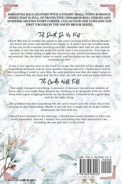 Samantha Baca delivers with a steamy small town romance series that is full of protective cinnamon roll heroes and suspense around every corner. Collection one contains the first 2 books in the Haven Brook series. 'Til Death Do Us Part I knew Mia was in trouble the moment she came running back to Haven Brook-the home she swore she would never return to. It wasn't just the terrified look in her eye or the constant watching over her shoulder that told me she needed my help. It was the way my body felt every time I was around her. The urge to protect her while trying to fight the electricity that sizzled between us when we touched. But she wasn't mine to touch, and her being on the run was a harsh reminder of why. It was a race against time as she tried to escape the clutches of her abusive and controlling husband, and we were quickly running out of it. I knew that I had to do everything I could to save Mia, the only problem was that she wasn't mine to save. I learned that the hard way the first time she left and took my heart with her. The Cradle Will Fall One night changed everything. A moment of pleasure turned into months of stress after a one-night fling showed up, claiming to be pregnant with my child. Even with regret weighing heavily on my shoulders, I wanted to be a good man and do the right thing. The problem was that something felt off, and it wasn't just the strain that it was putting on my relationship. Maybe it was the lies I caught her in or the sudden infatuation she had with me. I should have listened to the warnings. I should have paid attention to what was really important. Instead, I almost lost everything that ever mattered to me, including the one girl that I truly loved.