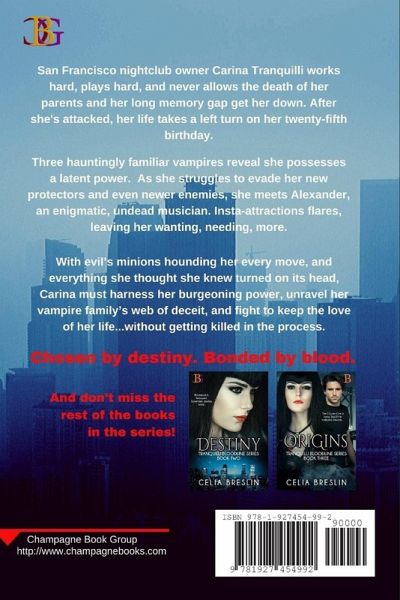 San Francisco nightclub owner Carina Tranquilli works hard, plays hard, and never allows the death of her parents and her twelve-year memory gap to get her down. But her life takes a left turn when a witch attacks her on her twenty-fifth birthday. Three hauntingly familiar vampires emerge to reveal she possesses a latent power. To protect her from their enemies, they admit to wiping her memories clean and abandoning her as a child, but now they need her help. As she struggles to evade her new protectors and even newer enemies, she meets Alexander, an enigmatic, undead musician. Insta-lust flares, leaving her wanting more. With evil's minions hounding her every move, and everything she thought she knew turned on its axis, Carina must harness her burgeoning power, unravel her vampire family's web of deceit, and fight to have a love life... without getting killed in the process.