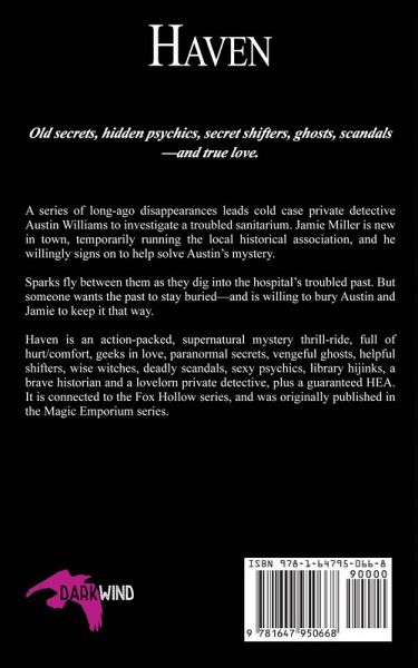 Old secrets, hidden psychics, secret shifters, ghosts, scandals-and true love. A series of long-ago disappearances leads cold case private detective Austin Williams to investigate a troubled sanitarium. Jamie Miller is new in town, temporarily running the local historical association, and he willingly signs on to help solve Austin's mystery. Sparks fly between them as they dig into the hospital's troubled past. But someone wants the past to stay buried-and is willing to bury Austin and Jamie to keep it that way. Haven is an action-packed, supernatural mystery thrill-ride, full of hurt/comfort, geeks in love, paranormal secrets, vengeful ghosts, helpful shifters, wise witches, deadly scandals, sexy psychics, library hijinks, a brave historian and a lovelorn private detective, plus a guaranteed HEA. Haven takes place in the Fox Hollow universe.