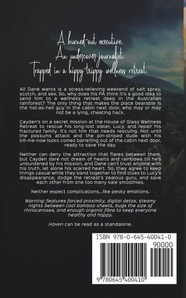 A burned-out executive. An undercover journalist. Trapped together in a hippy-trippy wellness retreat. All Dane wants is a stress-relieving weekend of salt spray, scotch, and sex. So, why does his PA think it's a good idea to send him to a wellness retreat deep in the Australian tropical rainforest? The only thing that makes the place bearable is the hot-as-hell guy in the cabin next door, who may or may not be a lying, cheating hack. Cayden's on a secret mission at the House of Glass Wellness Retreat to rescue his long-lost sister, Lucy, and repair his fractured family. It's not him that needs saving. Not until the possums attack and the pin-striped dude with his kill-me-now looks comes barrelling out of the cabin next door, ready to save the day. Neither can deny the attraction that flares between them, but Cayden dare not dream of hearts and rainbows till he's unburdened by his mission, and Dane can't trust anyone with his truth, let alone his scarred heart. So, they resolve to keep things casual while they band together to find clues to Lucy's mysterious disappearance, dodge the retreat's zealous guru, and save each other from one too many kale smoothies. Neither expect complications...like pesky emotions. Warning: features forced proximity, digital detox, steamy nights between soft bamboo sheets, bugs the size of rhinoceroses, and enough organic fibre to keep everyone healthy and happy. Haven can be read as a standalone.