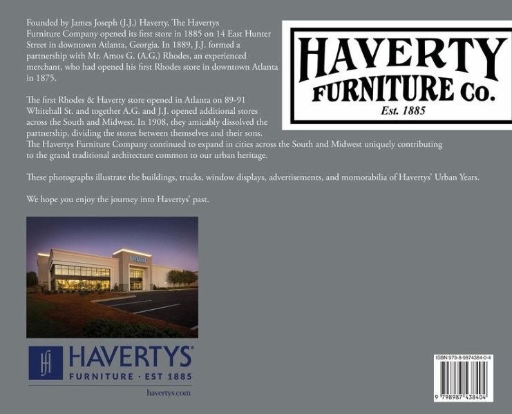 Founded by the James Joseph (J.J.) Haverty, The Havertys Furniture Company opened its first store in 1885 on 14 East Hunter Street in downtown Atlanta, Georgia. In 1889, J.J. formed a partnership with Mr. Amos G. (A.G.) Rhodes, an experienced merchant, who had opened his first Rhodes store in downtown Atlanta in 1875. The first Rhodes & Haverty store opened in Atlanta on 89-91 Whitehall St. and together A.G. and J.J. opened additional stores across the South and Midwest. In 1908, they amicably dissolved the partnership, dividing the stores between themselves and their sons. The Havertys Furniture Company continued to expand in cities across the South and Midwest uniquely contributing to the grand traditional architecture common to our urban heritage. These photographs illustrate the buildings, trucks, window displays, advertisements and memorabilia of Havertys' Urban Years. We hope you enjoy the journey into Havertys' past.