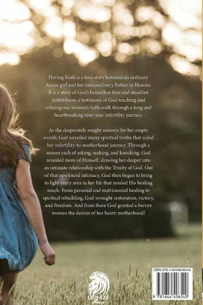 Having Faith is a love story between an ordinary Aussie girl and her extraordinary Father in Heaven. It is a story of God's boundless love and steadfast faithfulness; a testimony of God teaching and refining one woman's faith-walk through a long and heartbreaking nine-year infertility journey. As she desperately sought answers for her empty womb, God unveiled many spiritual truths that aided her infertility-to-motherhood journey. Through a season each of asking, seeking, and knocking, God revealed more of Himself, drawing her deeper into an intimate relationship with the Trinity of God. Out of that newfound intimacy, God then began to bring to light every area in her life that needed His healing touch. From personal and matrimonial healing to spiritual rebuilding, God wrought restoration, victory, and freedom. And from there God granted a barren woman the desires of her heart: motherhood!