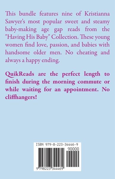 This bundle features nine of Kristianna Sawyer's most popular sweet and steamy baby-making age gap reads from the "Having His Baby" Collection. These young women find love, passion, and babies with sexy older men. No cheating and always a happy ending. QuikReads are the perfect length to finish during the morning commute or while waiting for an appointment. No cliffhangers!