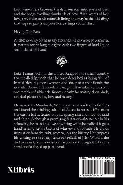 Lost somewhere between the drunken romantic poets of past and the hedge dwelling drunkards of now. With words of lost love, travesties to his stomach lining and maybe the odd ditty that tugs so gently on your heart strings comes this.. Having The Rats A self-hate diary of the nearly drowned. Read, enjoy, or besmirch, it matters not so long as a glass with two fingers of hard liquor are in the other hand