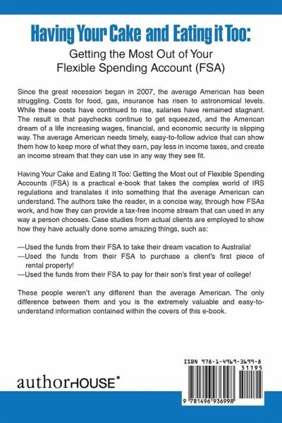 Since the great recession began in 2007, the average American has been struggling. Costs for food, gas, insurance has risen to astronomical levels. While these costs have continued to rise, salaries have remained stagnant. The result is that paychecks continue to get squeezed, and the American dream of a life increasing wages, financial, and economic security is slipping way. The average American needs timely, easy-to-follow advice that can show them how to keep more of what they earn, pay less in income taxes, and create an income stream that they can use in any way they see fit. Having Your Cake and Eating It Too: Getting the Most out of Flexible Spending Accounts (FSA) is a practical e-book that takes the complex world of IRS regulations and translates it into something that the average American can understand. The authors take the reader, in a concise way, through how FSAs work, and how they can provide a tax-free income stream that can used in any way a person chooses. Case studies from actual clients are employed to show how they have actually done some amazing things, such as: Used the funds from their FSA to take their dream vacation to Australia! Used the funds from their FSA to purchase a clients first piece of rental property! Used the funds from their FSA to pay for their sons first year of college! These people werent any different than the average American. The only difference between them and you is the extremely valuable and easy-to-understand information contained within the covers of this e-book.