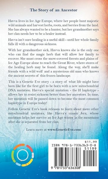 Havva lives in Ice Age Europe, where her people hunt majestic wild animals and harvest herbs, roots, and berries from the land. She has always wanted to be a hunter, but her grandmother says he clan needs her to be a healer instead. Havva isn't sure healing is a useful skill - until her whole family falls ill with a dangerous sickness. With her grandmother sick, Havva knows she is the only one who can find the magic herb that will allow her family to recover. She must cross the snow-covered forests and plains of Ice Age Europe alone to reach the Great River, where stores of the healing herb may be found. Along the way, she'll make friends with a wild wolf and a mysterious old man who knows the ancient secrets of this frozen landscape. This is a Genetic Eve story - a story of what life might have been like for the first girl to be born with a new mitochondrial DNA mutation. Havva's special mutation - the H haplotype - allows her to resist sickness better than her ancestors. In time, her mutation will be passed down to become the most common haplotype in Europe today! Follow Genetic Eve's book releases to learn more about other mitochondrial mutators, like Havva's cousin Jera, whose mutation helps her to survive an Ice Age winter in the mountains after she is separated from her clan. Learn more at GeneticEve.com,