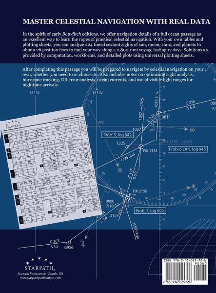 In the spirit of early Bowditch editions, we offer navigation details of a full ocean passage as an excellent way to learn the ropes of practical celestial navigation. With your own tables and plotting sheets, you can analyze 224 timed sextant sights of sun, moon, stars, and planets to obtain 26 position fi xes to fi nd your way along a 2,800-nmi voyage lasting 17 days. Solutions are provided by computation, workforms, and detailed plots using universal plotting sheets. After completing this passage you will be prepared to navigate by celestial navigation on your own, whether you need to or choose to. Also includes notes on optimizing sight analysis, hurricane tracking, DR error analysis, ocean currents, and use of visible light ranges for nighttime arrivals.