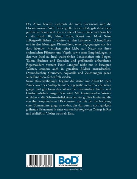 Der 1938 in Nürnberg geborene Autor bereiste mehrfach die sechs Kontinente und die Ozeane unserer Welt. Seine große Leidenschaft galt dabei dem pazifischen Raum und dort vor allem Hawaii. Siebenmal besuchte er die Inseln Big Island, Oahu, Kauai und Maui. Seine außergewöhnlichen Erlebnisse an den kulturellen Schauplätzen und in den lebendigen Kleinstädten, seine Begegnungen mit den dort lebenden Menschen, seine Liebe zur Natur mit ihren endemischen Pflanzen und Vögeln sowie seine Empfindungen in den von Insel zu Insel wechselnden Landschaften mit Bergen, Tälern, Buchten und Stränden und größtenteils unberührten Regenwäldern versteht Peter Landgraf nicht nur in bewegten Worten, sondern auch in gemalten Bildern auszudrücken. Dreiundsechzig Gouachen, Aquarelle und Zeichnungen geben seine Eindrücke wieder. Seine Reiseerzählungen beginnt der Autor mit ALOHA, dem Zauberwort des Archipels, mit dem gegrüßt und auf Wiedersehen gesagt und gleichsam das Wesen der hawaiischen Kultur und Gastfreundschaft ausgedrückt wird. Mit faszinierenden Worten schildert er die Sehenswürdigkeiten der vier großen Inseln und die von ihm empfundenen Höhepunkte, um mit der Beobachtung eines Sonnenuntergangs zu enden, der das zuerst noch goldgelb glühende Firmament in einer wahren Farborgie von Orange in Rot und schließlich Violett wechseln lässt.