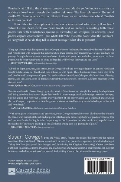 Pandemic at full tilt, the diagnosis came--cancer. Maybe you've known crisis or are walking a loved one through the terrible unknown. The heart plummets. The mind shrills. We blame genetics. Toxins. Lifestyle. How can we not blame ourselves? Can this be thrown on God? If we listen to the emptiness behind every unanswered why, what will we hear? While life and death circle overhead, heckle and intimidate, exhausting faith, these poems talk with touchstones around us. Eavesdrop on whispers for answers. These poems explore what we have--and what's left. Who made the hawk? And the lionhearted songbird? What do they tell us about courage? What else is present?