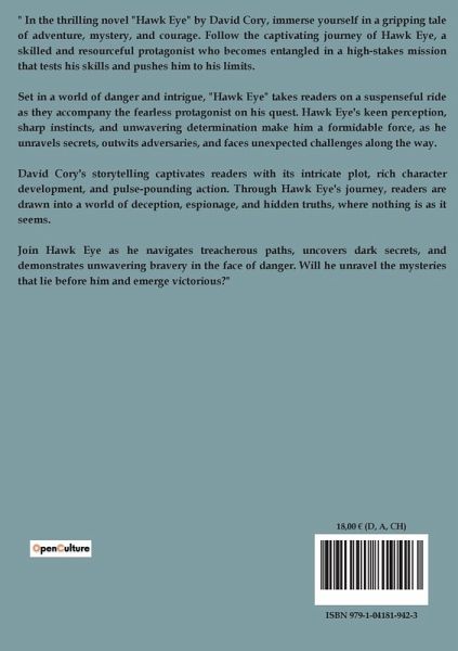 " In the thrilling novel "Hawk Eye" by David Cory, immerse yourself in a gripping tale of adventure, mystery, and courage. Follow the captivating journey of Hawk Eye, a skilled and resourceful protagonist who becomes entangled in a high-stakes mission that tests his skills and pushes him to his limits. Set in a world of danger and intrigue, "Hawk Eye" takes readers on a suspenseful ride as they accompany the fearless protagonist on his quest. Hawk Eye's keen perception, sharp instincts, and unwavering determination make him a formidable force, as he unravels secrets, outwits adversaries, and faces unexpected challenges along the way. David Cory's storytelling captivates readers with its intricate plot, rich character development, and pulse-pounding action. Through Hawk Eye's journey, readers are drawn into a world of deception, espionage, and hidden truths, where nothing is as it seems. Join Hawk Eye as he navigates treacherous paths, uncovers dark secrets, and demonstrates unwavering bravery in the face of danger. Will he unravel the mysteries that lie before him and emerge victorious?"