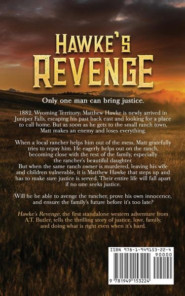 Only one man can bring justice. 1882, Wyoming Territory: Matthew Hawke is newly arrived in Juniper Falls, escaping his past back east and looking for a place to call home. But as soon as he gets to the small ranch town, Matt makes an enemy and loses everything. When a local rancher helps him out of the mess, Matt gratefully tries to repay him. He eagerly helps out on the ranch, becoming close with the rest of the family, especially the rancher's beautiful daughter. But when the same ranch owner is murdered, leaving his wife and children vulnerable, it is Matthew Hawke that steps up and has to make sure justice is served. Their entire life will fall apart if no one seeks justice. Will he be able to avenge the rancher, prove his own innocence, and ensure the family's future before it's too late? Hawke's Revenge, the first standalone western adventure from A.T. Butler, tells the thrilling story of justice, love, family, and doing what is right even when it's hard.