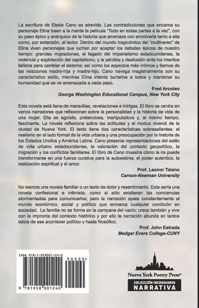 La escritura de Elssie Cano es atrevida. Las contradicciones que encarna su personaje Elina traen a la mente la película "Todo en todas partes a la vez", con su paso épico y anárquico de la historia que amenaza con envolverla tanto a ella como, por extensión, al lector. Dentro del mundo tragicómico del "multiverso" de Elina viven personajes que luchan por aceptar los debates épicos de nuestro tiempo: grandes migraciones, el legado del imperialismo estadounidense, la violencia y explotación del capitalismo, y la pérdida y desilusión ante los intentos fallidos para cambiar el sistema; así como los aspectos más íntimos y tiernos de las relaciones madre-hija y madre-hijo. Cano navega magistralmente con su característico estilo, mientras Elina intenta burlarlos a todos y mantener su humanidad que se ve amenazada a cada >Fred Arcoleo >Esta novela está llena de maravillas, revelaciones e intrigas. El libro se centra en varios narradores que reflexionan sobre la personalidad y la historia de vida de una mujer. Ella es egoísta, pretenciosa, manipuladora y, al mismo tiempo, fascinante. La novela reflexiona sobre las actitudes y el modus vivendi de la ciudad de Nueva York. El texto tiene dos características sobresalientes: el realismo en el lado formal de la vida urbana y una preocupación por la historia de los Estados Unidos y América Latina. Cano presenta representaciones del estilo de vida urbano estadounidense, la valoración del contexto geopolítico, la migración y los conflictos familiares. El libro de Cano muestra cómo la ira puede transformarse en una fuerza curativa >Prof. Leonor Taiano >No leemos una novela familiar o un texto de dolor y resentimiento. Esta sería una novela confesional e intimista, como si sólo existieran las conciencias atormentadas para comunicarlos; pero la narración apela constantemente al mundo económico, social y político que enmarca cualquier condición en sociedad. La familia no se forma en la campana del vacío; crece también y vive con la impronta del contexto histórico y por ello la narración abunda en >Prof. John Estrada Medgar Evers College-CUNY