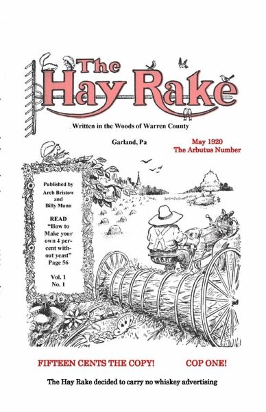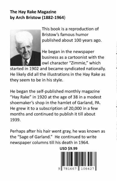 This is a reproduction of Arch Bristow's famous humor magazine published about 100 years ago. He began in the newspaper business as a cartoonist with the owl character "Zimmie", which began in 1902 and became syndicated nationally. He likely did all the illustrations in the Hay Rake as they seem to be in his style. He began the self-published monthly magazine "Hay Rake" in 1920 at the age of 38, in a modest shoemaker's shop in hamlet of Garland PA. He grew it to a subscription of 20,000 in a few months and continued to publish it till about 1939. At some point, perhaps after his hair went gray, he was known as the "Sage of Garland". He continued to write newspapers columns till his death in 1964