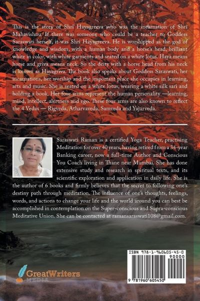This is the story of Shri Hayagreeva who was the incarnation of Shri Mahavishnu. If there was someone who could be a teacher to Goddess Saraswati herself, it was Shri Hayagreeva. He is worshipped as the god of knowledge and wisdom, with a human body and a horse's head, brilliant white in color, with white garments and seated on a white lotus. Haya means horse and griva means neck. So the deity with a horse head from his neck is known as Hayagriva. The book also speaks about Goddess Saraswati, her incarnations, her worship and the important place she occupies in learning, arts and music. She is seated on a white lotus, wearing a white silk sari and holding a book. Her four arms represent the human personality -learning, mind, intellect, alertness and ego. These four arms are also known to reflect the 4 Vedas - Rigveda, Atharvaveda, Samveda and Yajurveda.