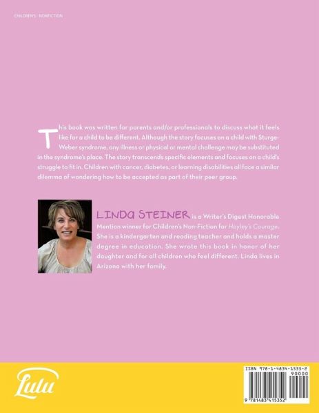 This book was written for parents and/or professionals to discuss what it feels like for a child to be different. Although the story focuses on a child with Sturge-Weber syndrome, any illness or physical or mental challenge may be substituted in the syndrome's place. The story transcends specific elements and focuses on a child's struggle to fit in. Children with cancer, diabetes, or learning disabilities all face a similar dilemma of wondering how to be accepted as part of their peer group.