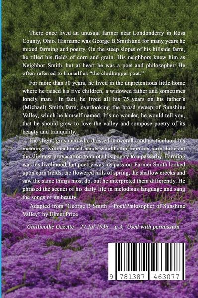 There once lived an unusual farmer near Londonderry in Ross County, Ohio. His name was George B Smith and for many years he mixed farming and poetry. On the steep slopes of his hillside farm, he tilled his fields of corn and grain. His neighbors knew him as Neighbor Smith, but at heart he was a poet and philosopher. He often referred to himself as "the clodhopper poet." For more than 50 years, he lived in the unpretentious little home where he raised his five children, a widowed father and sometimes lonely man. In fact, he lived all his 75 years on his father's (Michael) Smith farm, overlooking the broad sweep of Sunshine Valley, which he himself named. It's no wonder, he would tell you, that he should grow to love the valley and compose poetry of its beauty and tranquility. The slight, gray man who dressed in overalls and gesticulated his meanings with calloused hands would stop from his farm duties at the slightest provocation to quote his poetry to a passerby. Farming was his livelihood, but poetry was his passion. Farmer Smith looked upon corn fields, the flowered hills of spring, the shallow creeks and saw the same things most do, but he interpreted them differently. He phrased the scenes of his daily life in melodious language and sang the songs of its beauty.