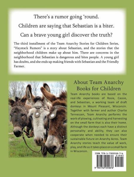 There’s a rumor going ‘round. Children are saying that Sebastian is a biter. Can a brave young girl discover the truth? The third installment of the Team Anarchy Stories for Children Series, "Haystack Rumors" is a story about Sebastian, and the stories that the neighborhood children make up about him. There are concerns in the neighborhood that Sebastian is dangerous and bites people. A young girl has doubts, and she ends up making friends with Sebastian and the Friendly Farmer. Team Anarchy stories are based on a real farm in Wisconsin, where a real-life team of donkeys named Rosie, Cassie, and Sebastian work and play. Each story is based on a real event that took place on the farm, which is explained at the end in a short "story behind the story" section. Previous books in the series include "Rosie's New Harness" and "Popcorn Day."