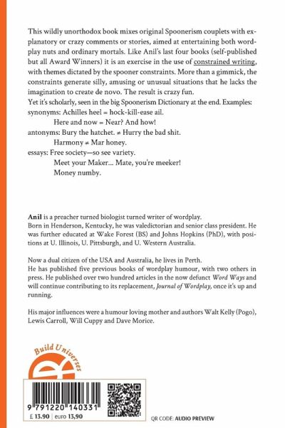 This wildly unorthodox book mixes original Spoonerism couplets with explanatory or crazy comments or stories, aimed at entertaining both wordplay nuts and ordinary mortals. Like Anil's last four books (self-published but all Award Winners) it is an exercise in the use of constrained writing, with themes dictated by the spooner constraints. More than a gimmick, the constraints generate silly, amusing or unusual situations that he lacks the imagination to create de novo. The result is crazy fun. Yet it's scholarly, seen in the big Spoonerism Dictionary at the end. Examples: synonyms: Achilles heel = hock-kill-ease ail. Here and now = Near? And how! antonyms: Bury the hatchet. ¿ Hurry the bad shit. Harmony ¿ Mar honey. essays: Free society-so see variety. Meet your Maker... Mate, you're meeker! Money numby. Anil is a preacher turned biologist turned writer of wordplay. Born in Henderson, Kentucky, he was valedictorian and senior class president. He was further educated at Wake Forest (BS) and Johns Hopkins (PhD), with positions at U. Illinois, U. Pittsburgh, and U. Western Australia. Now a dual citizen of the USA and Australia, he lives in Perth. He has published five previous books of wordplay humour, with two others in press. He published over two hundred articles in the now defunct Word Ways and will continue contributing to its replacement, Journal of Wordplay, once it's up and running. His major influences were a humour loving mother and authors Walt Kelly (Pogo), Lewis Carroll, Will Cuppy and Dave Morice.